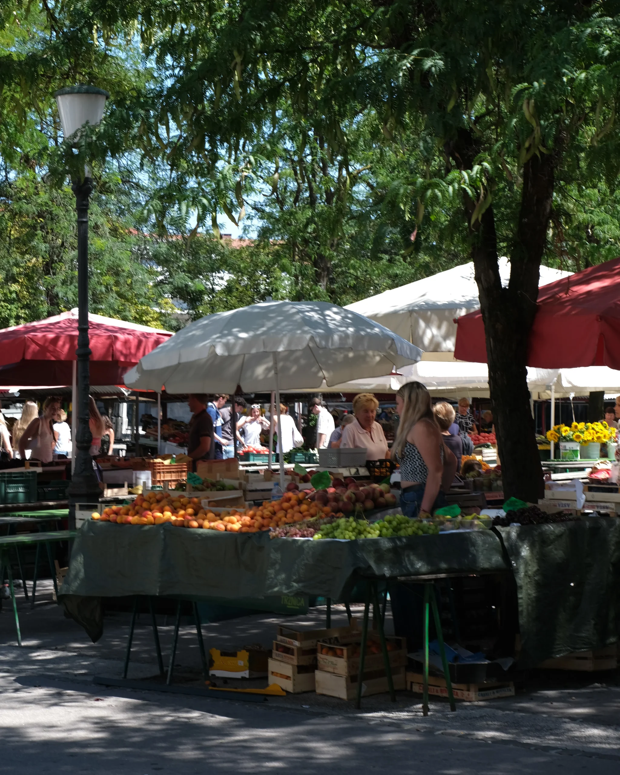 The Central Market (Osrednja tržnica) is the city’s largest and most iconic. In summer, it’s open Monday to Friday from 6:00 to 18:00 and on Saturdays until 16:00 (winter hours: Monday to Saturday until 16:00, closed Sundays and holidays). Saturdays are the busiest, when the market comes alive with the biggest variety of vendors, including artisans selling handmade goods around Pogačarjev trg. Here you’ll also find stalls offering Slovenia’s famous honey, homemade sauerkraut, fresh bread, and pastries.